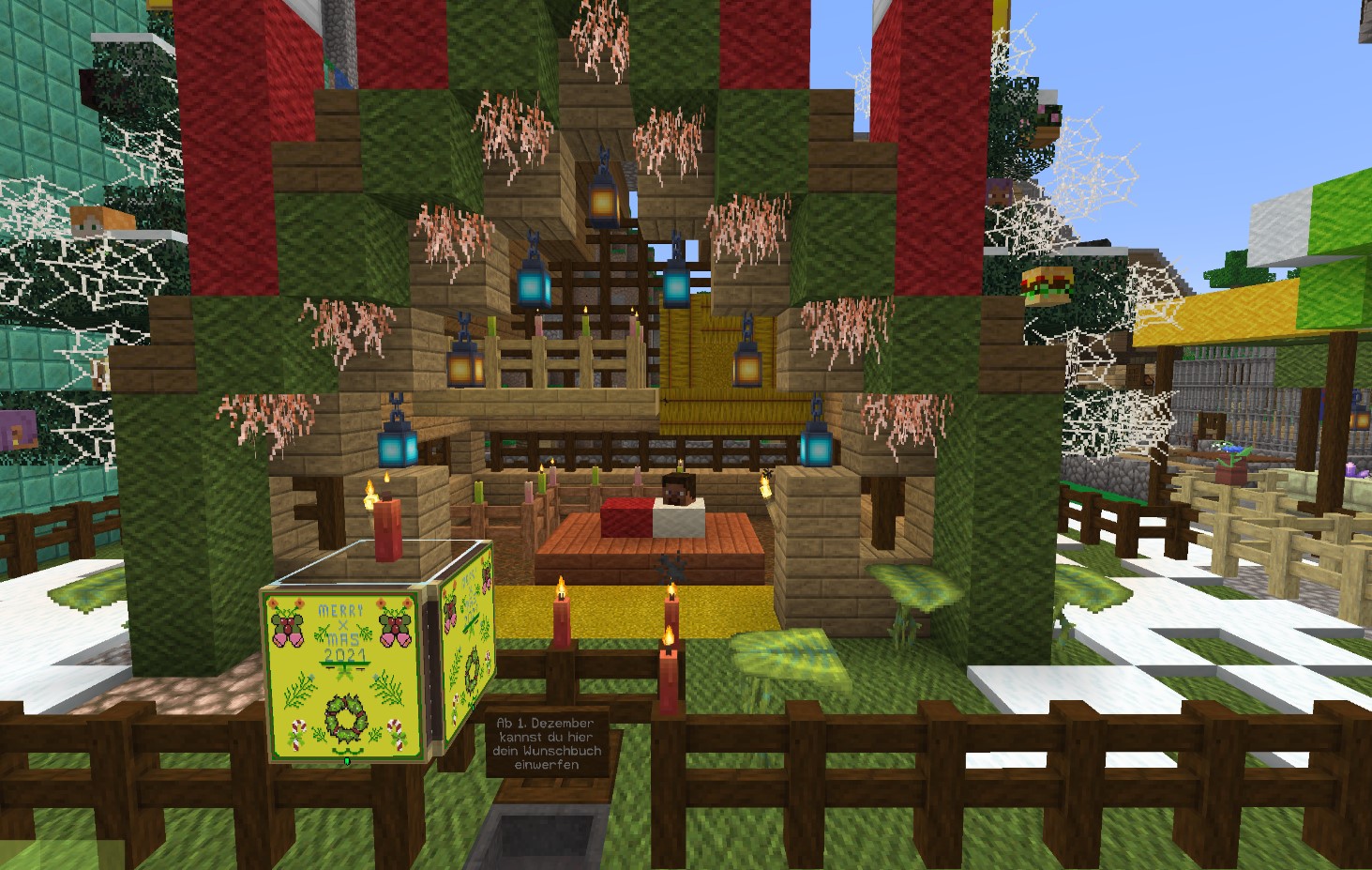 Material: Rote und grüne Wolle, für das Kreuz Goldblöcke. Fackeln und Redstonefackeln, Spinnweben, Fichtenholz, Eichenholzbretter.