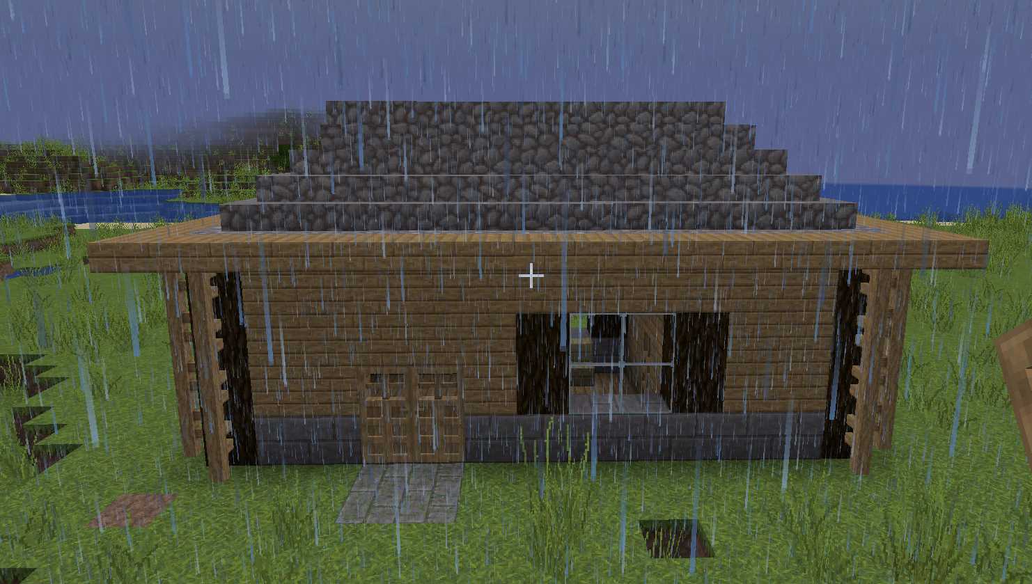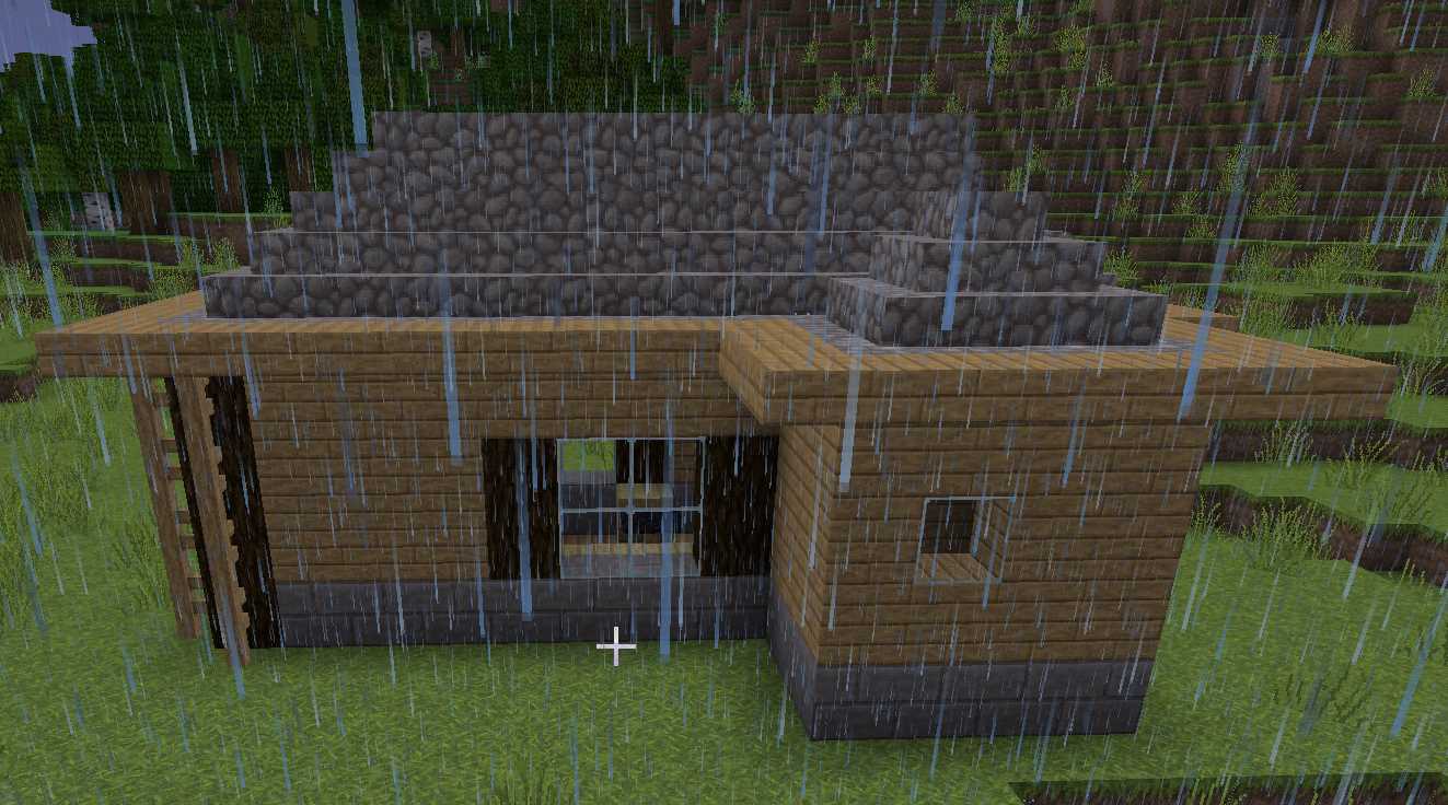 Das Haus besteht aus Eichenholzbrettern, Eichenholz, Glas, Cobblestone, Steinziegel, bemooster Steinziegel, Eichenholzzäune.
