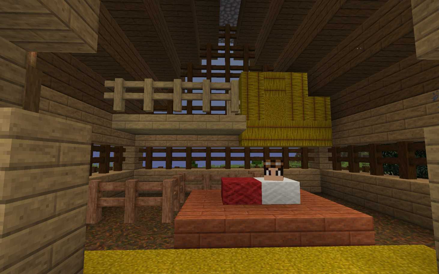 Innenansicht mit Jesuskind, was nur ein Minecraftkopf ist. Kann aber nach Belieben gewechselt werden. Unten stehen sonst 2 Kühe im Gatter und oben 2 Schafe. Diese wurden mit citizense/npc erstellt. Neben dem Christkind dann Maria und Josef, ebenfalls mit Citizense erstellt.